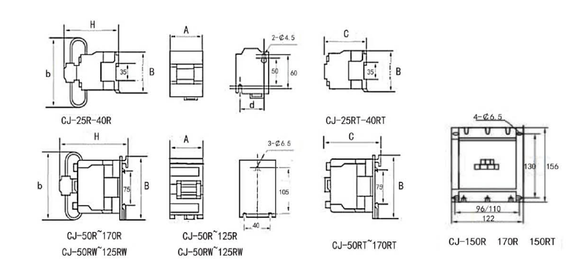 ·CJ-18R~CJ-40R提供两对辅触头,可选1开1闭代号11型 或2开代号20型,默认11型。 ·CJ-50R~CJ-125R提供三对辅触头,全部为2开1闭代号21型(可省略)。 ·CJ-150R 170R提供一对常开辅助触头。 ·RT型产品没有限流机构和限流阻抗,必须工作在串接电抗器的回路中。 ·25kvar~60kvar 可选配外引接线式,下单清注明。 |